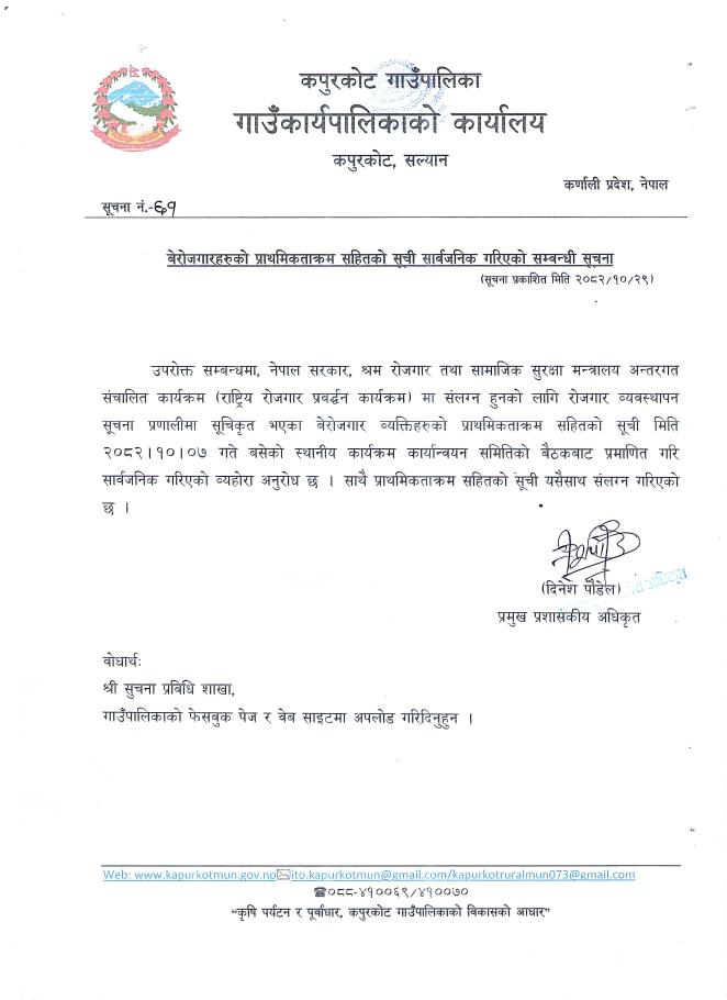 बेरोजगारहरुको प्राथमिक्रम सहितको सूची सार्वजनिक गरिएको सूचना