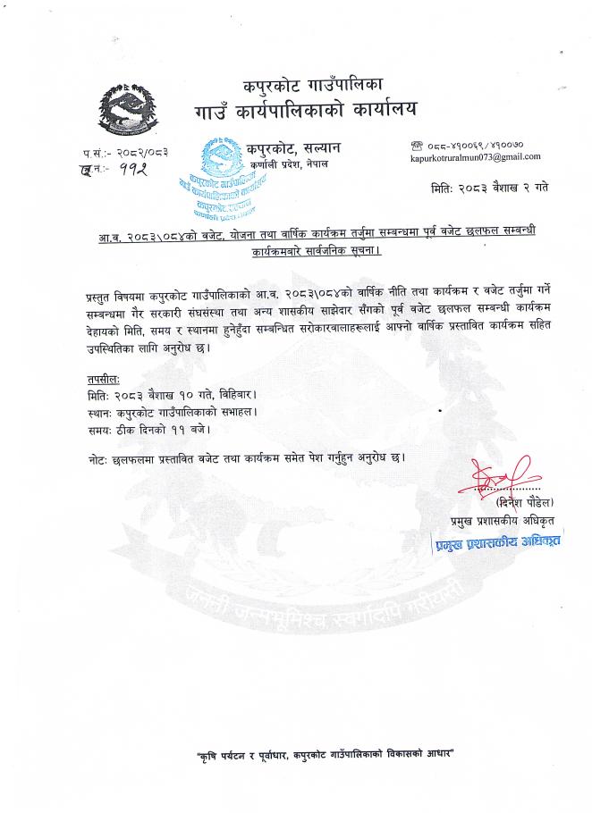 आ.व. २०८२/०८४ को बजेट, योजना तथा वार्षिक कार्यक्रम तर्जुमा सम्बन्धमा पूर्व बजेट छलफल सम्बन्धी कार्यक्रमबारे सार्वजनिक सूचना।