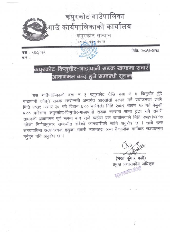 कपुरकोट गाडा पानी सडक बन्द हुने सूचना