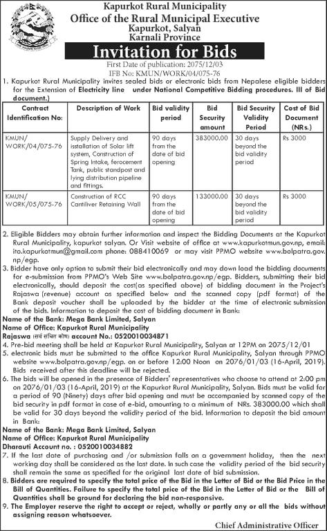 किमुचाैर खानेपानी अायाेजना सम्बन्धी वाेलपत्र  प्रकाशित भएकाे सुचना
