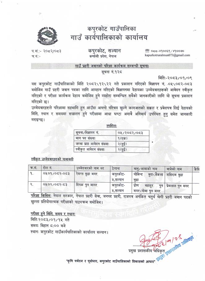 गाउँप्रहरी जवानको परिक्षा सम्बन्धी सूचना।
