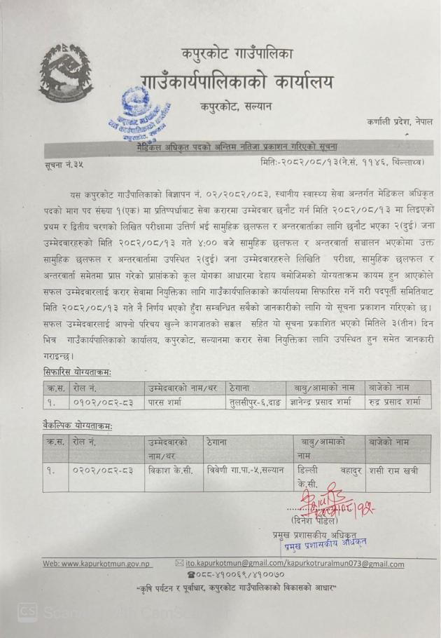 मेडिकल अधिकृतको अन्तिम नतिजा प्रकाशन सम्बन्धी सूचना।
