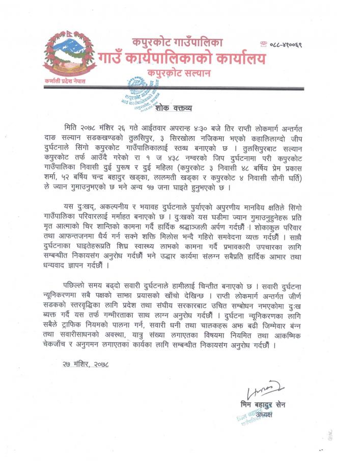 दुःखद्, अकल्पनीय र भयावह दुर्घटनाले पुर्याएको अपुरणीय मानविय क्षतिले सिंगो गाउँपालिका परिवारलाई मर्माहत बनाएको छ । दुःखको यस घडीमा मृतकहरुप्रति हार्दिक श्रद्धाञ्जली । घाइते सबैलाई शिघ्र स्वास्थ्य लाभको कामना ।